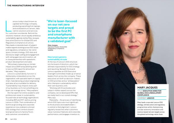 Mary leads corporate Lenovo ESG strategy, climate action and regulatory programmes while championing circular economy innovation and science-based net zero targets across the global technology value chain.