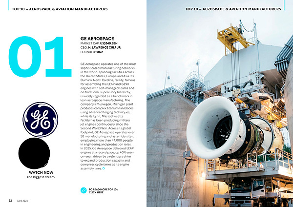 GE Aerospace operates one of the most sophisticated manufacturing networks in the world, spanning facilities across the United States, Europe and Asia. Its Durham, North Carolina, facility, famous for assembling the LEAP and GE9X engines with self-managed teams and no traditional supervisory hierarchy, is widely regarded as a benchmark in lean aerospace manufacturing. The company’ s Muskegon, Michigan plant produces complex titanium fan blades using advanced forging techniques, while its Lynn, Massachusetts facility has been producing military jet engines continuously since the Second World War. Across its global footprint, GE Aerospace operates over 50 manufacturing and assembly sites, employing more than 44,000 people in engineering and production roles. In 2025, GE Aerospace delivered LEAP engines at a record pace, up 40 % yearon-year, driven by a relentless drive to expand production capacity and compress cycle times at its engine assembly lines.