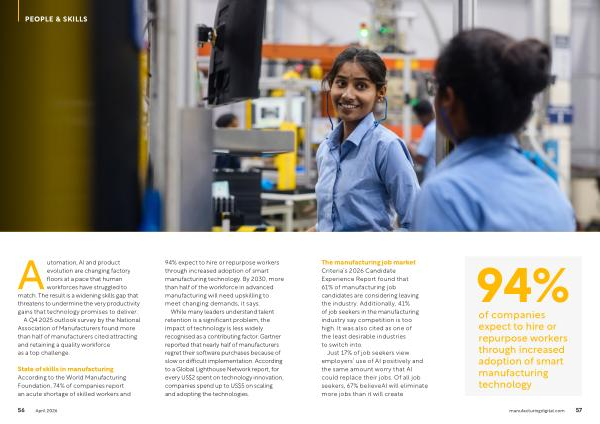 94 % expect to hire or repurpose workers through increased adoption of smart manufacturing technology. By 2030, more than half of the workforce in advanced manufacturing will need upskilling to meet changing demands, it says.