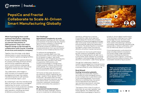 operations, shifting from a reactive to a predictive, data-driven approach. Collaborating with Fractal, the company deployed AI-powered packaging technology that continuously tracks production metrics and automatically adjusts key parameters in real time. This allows PepsiCo to maximize throughput, reduce waste, and improve efficiency, all without manual intervention.