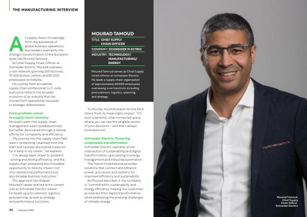 Mourad Tamoud serves as Chief Supply Chain Officer at Schneider Electric. He leads a supply chain organisation of approximately 80,000 employees, overseeing core functions including procurement, logistics, planning and strategy.