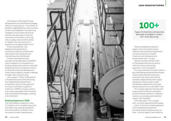 John Stewart, SVP Global Process Development at Fujifilm Biotechnologies, reflects on these lessons:“ The COVID-19 pandemic highlighted the critical need for resilient and adaptable manufacturing strategies in the biopharmaceutical industry. Key learnings include the importance of domestic onshoring, robust supply chains and the ability to rapidly scale up production in response to emerging health crises.”