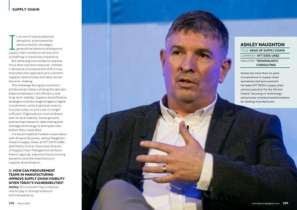 Ashley has more than 25 years of experience in supply chain operations and procurement. He leads NTT DATA ' s supply chain advisory practice for the UK and Ireland, focusing on technology and process-oriented transformations for leading manufacturers.