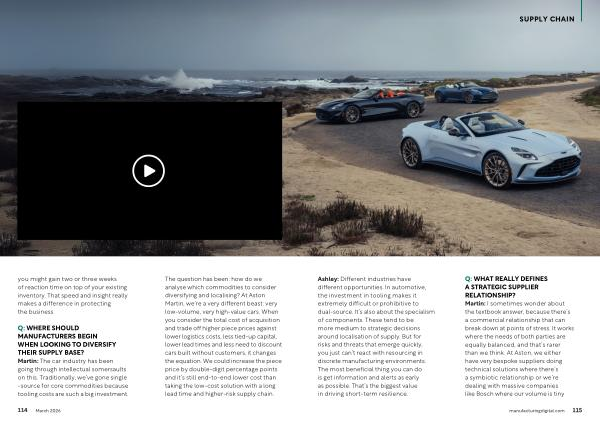 Q: WHAT REALLY DEFINES A STRATEGIC SUPPLIER RELATIONSHIP? Martin: I sometimes wonder about the textbook answer, because there’ s a commercial relationship that can break down at points of stress. It works where the needs of both parties are equally balanced, and that’ s rarer than we think. At Aston, we either have very bespoke suppliers doing technical solutions where there’ s a symbiotic relationship or we’ re dealing with massive companies like Bosch where our volume is tiny