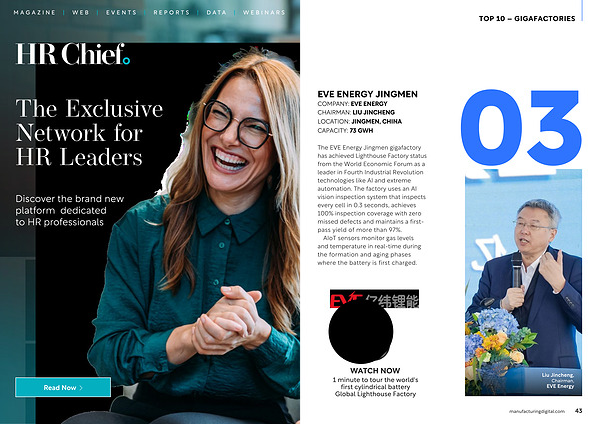 The EVE Energy Jingmen gigafactory has achieved Lighthouse Factory status from the World Economic Forum as a leader in Fourth Industrial Revolution technologies like AI and extreme automation. The factory uses an AI vision inspection system that inspects every cell in 0.3 seconds, achieves 100 % inspection coverage with zero missed defects and maintains a firstpass yield of more than 97 %.