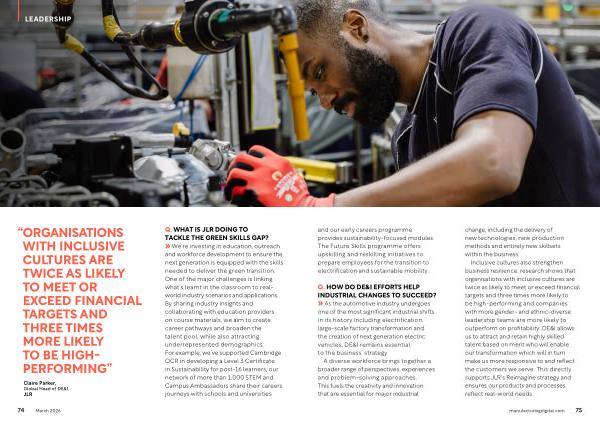 Inclusive cultures also strengthen business resilience: research shows that organisations with inclusive cultures are twice as likely to meet or exceed financial targets and three times more likely to be high‐performing and companies with more gender‐ and ethnic‐diverse leadership teams are more likely to outperform on profitability. DE & I allows us to attract and retain highly skilled talent based on merit who will enable our transformation which will in turn make us more responsive to and reflect the customers we serve. This directly supports JLR’ s Reimagine strategy and ensures our products and processes reflect real-world needs.