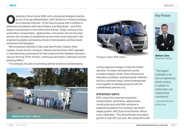 STRATEGIC UNITS MVC covers five important segments : transportation , automotive , agribusiness , construction and wind With solutions in engineering plastics the company has shown steady growth . MVC Executive Director , Gilmar Lima , celebrates : “ This diversification provided a growth of over 20 % per year . We closed 2014 with