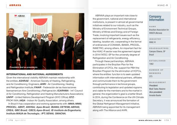 Through these partnerships , ABRAVA participates in the Brazilian Plan for the Elimination of CFCs , the support for PBH the Brazilian Program for the elimination of HCFCs , where the entities function is to seek updated information with international partners , affiliates and communicate them to the government through performance in technical groups , contributing to legislation and updated rograms and viable for the members and to the market in general , the organization ’ s goal is a better Brazil . In 2014 , during the Conference on the UN Climate Secretary , it was announced the formation of the Global Refrigerant Management Initiative , ABRAVA being appointed for its management along with The Alliance and AHRI .