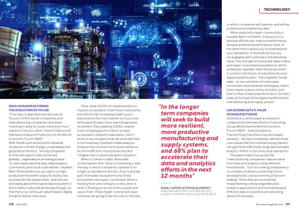 UNLOCKING DATA ’ S VALUE IN MANUFACTURING Outlined in a white paper produced in collaboration between Boston Consulting Group ( BCG ) and the World Economic Forum ( WEF ) – Data Excellence : Transforming manufacturing and supply systems – the two companies identify three core values that the manufacturing industry can gain from effectively using data and data analytics within its functions and operations .