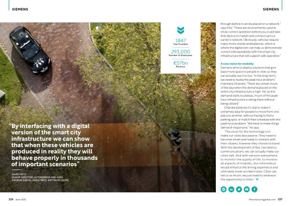 € 57bn Revenue . through before it can be placed on a network ,” says Fritz . “ There are environments used to show correct operation before you could take that device to market and connect up to a carrier ’ s network . Obviously , vehicles require many more checks and balances , which is where the digital twin can help us demonstrate correct interoperability with the smart city infrastructure that will support safe operation .”