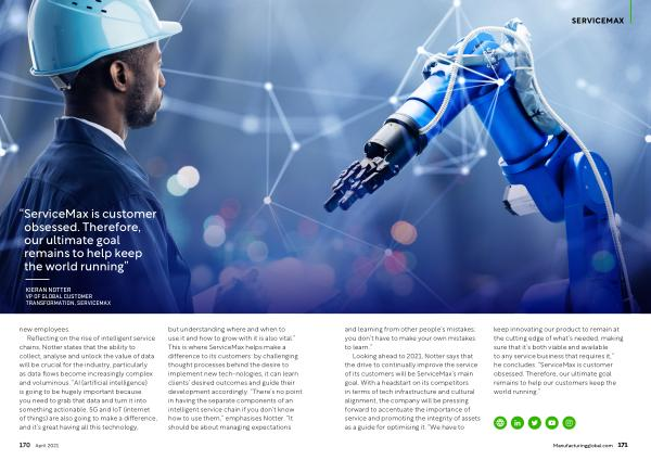 Looking ahead to 2021 , Notter says that the drive to continually improve the service of its customers will be ServiceMax ’ s main goal . With a headstart on its competitors in terms of tech infrastructure and cultural alignment , the company will be pressing forward to accentuate the importance of service and promoting the integrity of assets as a guide for optimising it . “ We have to keep innovating our product to remain at the cutting edge of what ’ s needed , making sure that it ’ s both viable and available to any service business that requires it ,” he concludes . “ ServiceMax is customer obsessed . Therefore , our ultimate goal remains to help our customers keep the world running .”