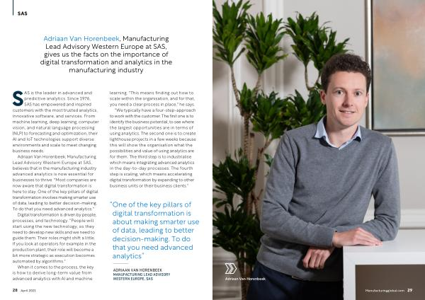 Adriaan Van Horenbeek , Manufacturing Lead Advisory Western Europe at SAS , gives us the facts on the importance of digital transformation and analytics in the manufacturing industry
