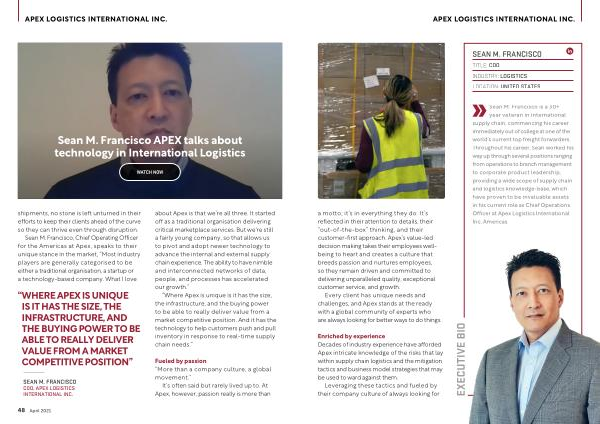 SEAN M . FRANCISCO COO , APEX LOGISTICS INTERNATIONAL INC . about Apex is that we ’ re all three . It started off as a traditional organisation delivering critical marketplace services . But we ' re still a fairly young company , so that allows us to pivot and adopt newer technology to advance the internal and external supply chain experience . The ability to have nimble and interconnected networks of data , people , and processes has accelerated our growth .”