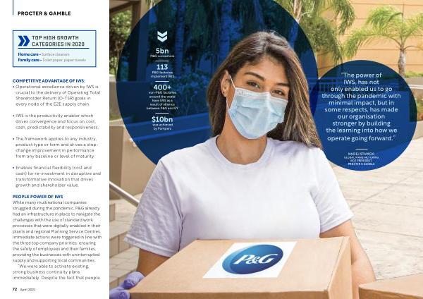 PEOPLE POWER OF IWS While many multinational companies struggled during the pandemic , P & G already had an infrastructure in place to navigate the challenges with the use of standard work processes that were digitally enabled in their plants and regional Planning Service Centres . Immediate actions were triggered in line with the three top company priorities : ensuring the safety of employees and their families , providing the businesses with uninterrupted supply and supporting local communities .