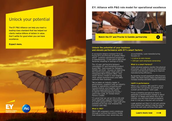 A successful alliance between Ernst & Young ( EY ) and Procter & Gamble ( P & G ) which - achieves operational excellence in manufacturing - is now used in 400 smart factories resulting in savings of $ 15b .