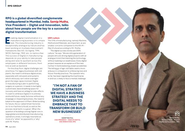 RPG is a global diversified conglomerate headquartered in Mumbai , India . Samip Mutha , Vice President – Digital and Innovation , talks about how people are the key to a successful digital transformation