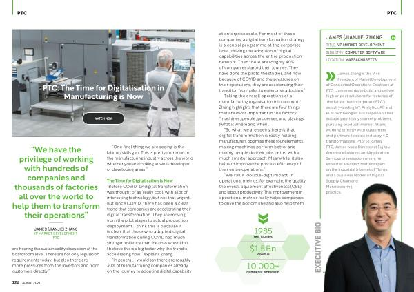 President of Market Development of Connected Operations Solutions at PTC . James works to build and deliver high impact solutions for factories of the future that incorporate PTC ’ s industry-leading IoT , Analytics , AR and PLM technologies . His responsibilities include prioritizing market problems , pursuing product-market fit and working directly with customers and partners to scale industry 4.0 transformations . Prior to joining PTC , James was a Director at Fujitsu America ’ s Business and Application Services organisation where he served as a subject matter expert on the Industrial Internet of Things and a business leader of Digital Supply Chain and Manufacturing practice .