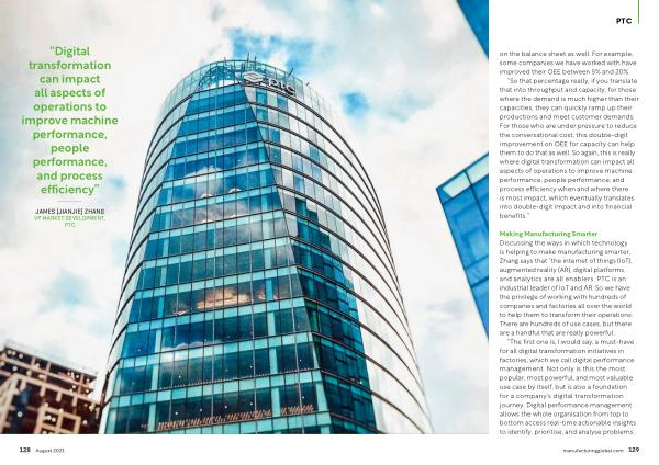 “ So that percentage really , if you translate that into throughput and capacity , for those where the demand is much higher than their capacities , they can quickly ramp up their productions and meet customer demands . For those who are under pressure to reduce the conversational cost , this double-digit improvement on OEE for capacity can help them to do that as well . So again , this is really where digital transformation can impact all aspects of operations to improve machine performance , people performance , and process efficiency when and where there is most impact , which eventually translates into double-digit impact and into financial benefits .”