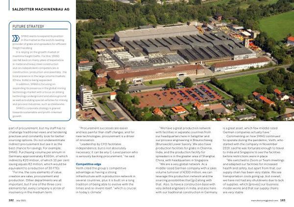 It is relying on the growth market of maritime freight traffic . For this , SMAG can fall back on many years of experience in metal and heavy steel construction and on independent competencies in construction , production and assembly . The local presence in the large volume markets ( China , India ) is being expanded .