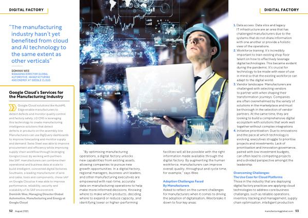 Google Cloud solutions like AutoML Edge enable manufacturers to detect defects and monitor quality control and factory safety . LG CNS is leveraging this technology to create manufacturing intelligence solutions that detect defects in products on the assembly line . Manufacturers can use BigQuery dashboards to improve forecasting and monitor supply and demand . Swiss Steel was able to improve procurement and efficiency while improving supply chain workflow through leveraging Google Cloud . By working with partners like SAP , manufacturers can combine their operational and business data at scale to build intelligent , connected digital factories . Southwire , a leading manufacturer of wire and cable , tools and components , chose SAP on Google Cloud as it was able to improve performance , reliability , security and scalability of its SAP environment . Dominik Wee , Managing Director Global Automotive , Manufacturing and Energy at Google Cloud