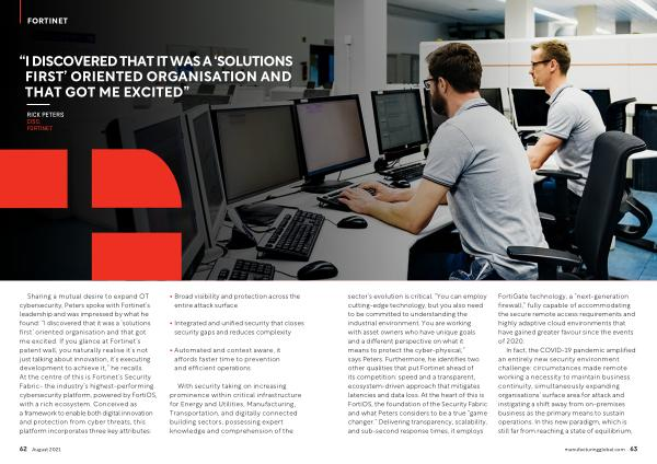 FORTINET sector ’ s evolution is critical . “ You can employ cutting-edge technology , but you also need to be committed to understanding the industrial environment . You are working with asset owners who have unique goals and a different perspective on what it means to protect the cyber-physical ,” says Peters . Furthermore , he identifies two other qualities that put Fortinet ahead of its competition : speed and a transparent , ecosystem-driven approach that mitigates latencies and data loss . At the heart of this is FortiOS , the foundation of the Security Fabric and what Peters considers to be a true “ game changer .” Delivering transparency , scalability , and sub-second response times , it employs