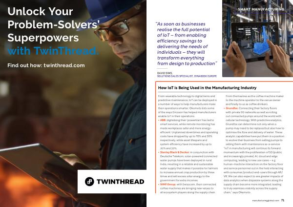 From wearable technology to digital twins and predictive maintenance , IoT can be deployed in a number of ways to help manufacturers make their operations smarter ; Okomoto lists some of the ways Ericsson has helped manufacturers enable IoT in their operations :