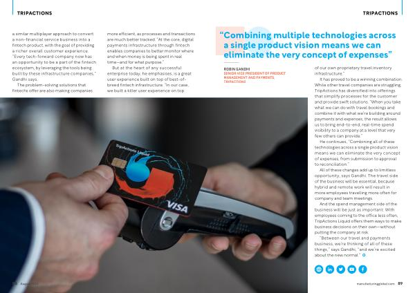 It has proved to be a winning combination . While other travel companies are struggling , TripActions has diversified into offerings that simplify processes for the customer and provide swift solutions . “ When you take what we can do with travel bookings and combine it with what we ’ re building around payments and expenses , the result allows us to bring end-to-end , real-time spend visibility to a company at a level that very few others can provide .”