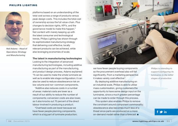 Neil Adams - Head of Operations Strategy and Manufacturing platforms based on an understanding of the total cost across a range of products versus peak design costs . This includes the total cost of ownership across the full value-chain . Plus changes to decision rights , KPI ’ s , and the governance model to make this happen .” Not content with merely keeping up with the latest consumer and technological trends , Philips Lighting has shown through its sophisticated manufacturing strategy that delivering cost effective , locally relevant products can be achieved , while also leveraging economies of scale .