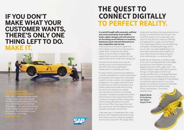 At SAP , we are helping our customers adapt to the ever-increasing demands of the digital economy by connecting their processes digitally across the entire supply chain . This enables a digital supply chain that transitions their go to market approach from cost savings and efficiency to a strategy that drives competitiveness and differentiation . We call this initiative Connect Digitally to Perfect Reality and while the subject touches on so many aspects of a company ’ s business , it ultimately gives the customer the perfect reality of their requirements – the perfect baseball cleats .