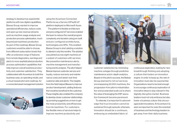 32 strategy to develop true experiential platforms with new digital capabilities , Biesse Group wanted to improve operational efficiencies , reduce costs and open up new revenue streams such as machine usage analysis and production process optimization , much beyond just machinery production . As part of the roadmap , Biesse Group customers would be able to choose from different subscription levels that offer an extensive range of features from remote diagnostics , warnings and alerts to more sophisticated production process optimization capabilities that help improve overall business productivity and customer satisfaction . They collaborated with Accenture to build the business case , an operating model , and a cloud-based pilot and roadmap , for a connected asset management solution using the Accenture Connected Platforms as a Service ( CPaaS ) IoT platform deployed on Microsoft Azure . The platform ’ s flexible architecture and preconfigured IoT services enabled the team to reduce the overall program complexity and duration using pre-built and pre-configured architectures , technologies and APIs . This enabled Biesse Group to start piloting a solution to clients in only five months . The solution was piloted across eight machines at a subset of customers with services like preventive maintenance alerts , machine management and manufacturing events analysis . The pilot helped Biesse improve customer service and loyalty , reduce warranty and maintenance costs and obtain real-time customer data and alerts . The insights from the field helped Biesse to improve product development , adding features that would be beneficial to the customer . These insights also enabled the company to develop closer customer relationships by providing suggestions on how to get the most productivity and efficiencies from its machines . For customers , the flexible menu of services helps to improve machine productivity and