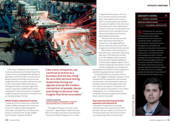 Industrial Solutions division for Hitachi Vantara in digital transformation and Industry 4.0 operating models , supply chain control towers , asset performance management , manufacturing operations , and quality and predictive maintenance . Sid helps customers create smart , connected factories and intelligent products . He also manages the industry leading Lumada Manufacturing Insights portfolio of products on behalf of Hitachi Ltd . Previously , Sid led the practice for Siemens Advanta and Deloitte Digital IIoT with a focus on IoT-enabled growth and operation improvement in the Industrial and Energy sectors .