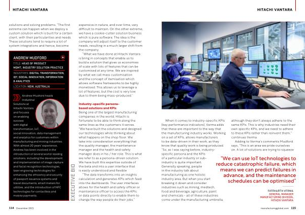Industry-specific personabased solutions and KPIs Being one of the largest manufacturing companies in the world , Hitachi is fortunate to be able to think along the same lines as the customers it serves . “ We have built the solutions and designed our technologies while thinking about what happens on the shop floor . We take into consideration everything that the quality manager , the maintenance manager and the health and safety manager does in his / her role . This is what we refer to as a persona-driven solution . We have built this expertise outside of the beta and into a user interface that is easily understood and flexible .