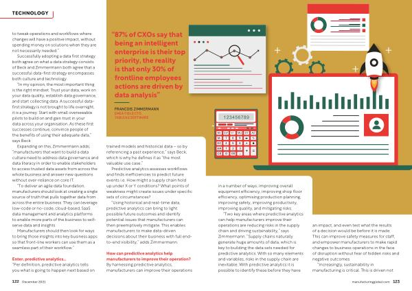 “ Two key areas where predictive analytics can help manufacturers improve their operations are reducing risks in the supply chain and driving sustainability ,” says Zimmermann . “ Supply chains naturally generate huge amounts of data , which is key to building the data sets needed for predictive analytics . With so many elements and variables , risks in the supply chain are inevitable . With predictive analytics it is possible to identify these before they have