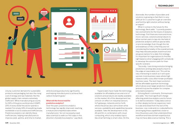 What will the future hold for predictive analytics ? Over the years , predictive analytics technology has rapidly improved , reaching a mature and simplified state where manufacturers “ do not necessarily need data scientists to walk our first steps in the direction of predictive analytics ,” says Beck .