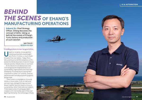 Edward Xu , Chief Strategy Officer , EHang discusses the concept of AAVs , taking us behind the scenes of EHang ’ s Yunfu factory and production of such solution