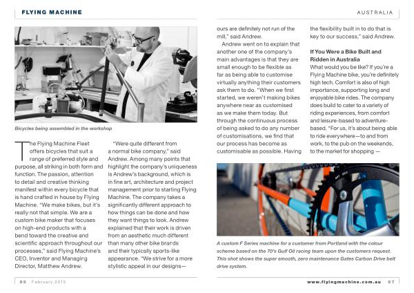 “ Were quite different from a normal bike company ,” said Andrew . Among many points that highlight the company ’ s uniqueness is Andrew ’ s background , which is in fine art , architecture and project management prior to starting Flying Machine . The company takes a significantly different approach to how things can be done and how they want things to look . Andrew explained that their work is driven from an aesthetic much different than many other bike brands and their typically sports-like appearance . “ We strive for a more stylistic appeal in our designs —