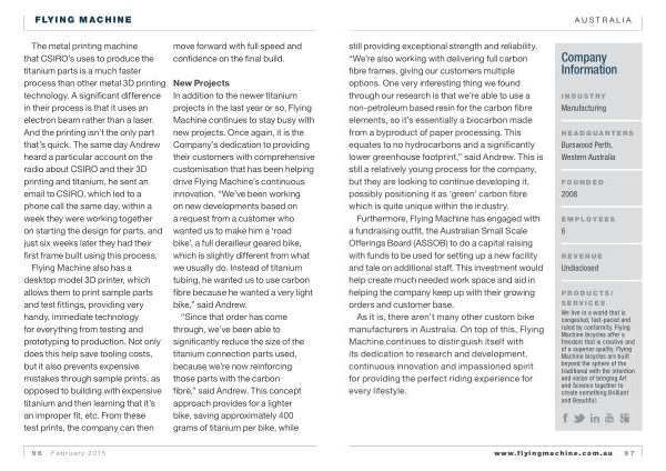 We live in a world that is congested , fast-paced and ruled by conformity . Flying Machine bicycles offer a freedom that is creative and of a superior quality . Flying Machine bicycles are built beyond the sphere of the traditional with the intention and vision of bringing Art and Science together to create something Brilliant and Beautiful . www . flyingmachine . com . au 97