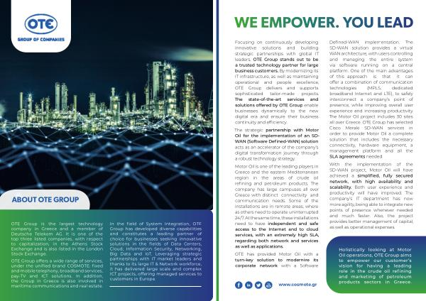 In the field of System Integration , OTE Group has developed diverse capabilities and constitutes a leading partner of choice for businesses seeking innovative solutions in the fields of Data Centers , Cloud , Information Security , Networking , Big Data and IoT . Leveraging strategic partnerships with IT market leaders and thanks to its large IT & Network workforce , it has delivered large scale and complex ICT projects , offering managed services to customers in Europe .