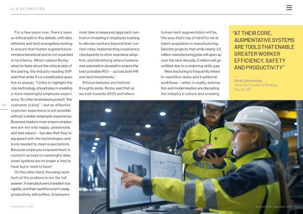 On the other hand , throwing more tech at the problem is not the full answer . If manufacturers transition too rapidly , and their workforce isn ’ t ready , productivity still suffers . Employers must take a measured approach centred on investing in employee training to elevate workers beyond their current roles ; implementing experience checkpoints to drive seamless adoption ; and identifying where humans and automation dovetail to ensure the best possible ROI -- across both HR and tech investments .”