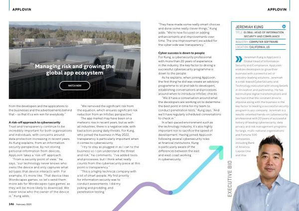 Global Head of Information Security and Compliance . AppLovin enables developers to grow their business with a powerful set of industry-leading solutions . Jeremiah is a risk-based CyberSecurity and Technology executive with strong beliefs in innovation and partnership . He has led multiple digital transformations and has found that the constant drive to improve along with the business is the key factor to leading a successful security program in any company . Jeremiah is a results-oriented hands-on cybersecurity professional with 20 years of successful history of leading cybersecurity , data privacy and risk management programs for large , multi-national organisations and Fortune 500 companies including Bank of America , Capital One and Visa .