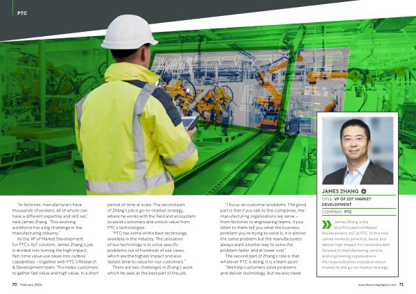 As the VP of Market Development for PTC ’ s IIoT solution , James Zhang ´ s job is divided into turning the high impact , fast-time value use cases into outbox capabilities – together with PTC ’ s Research & Development team . This helps customers to gather fast value and high value , in a short period of time at scale . The second part of Zhang ’ s job is go-to-market strategy , where he works with the field and ecosystem to assist customers and unlock value from PTC ’ s technologies .