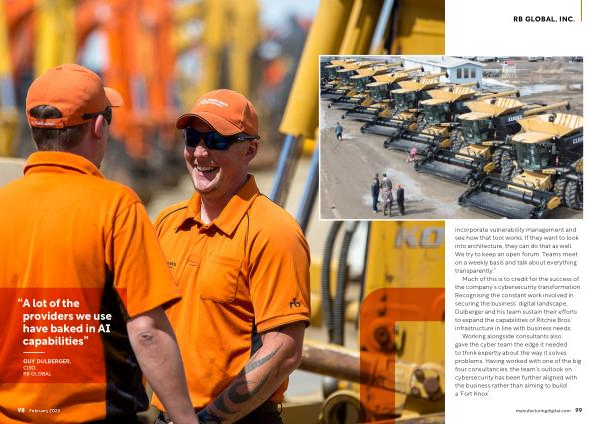 Much of this is to credit for the success of the company ’ s cybersecurity transformation . Recognising the constant work involved in securing the business ’ digital landscape , Dulberger and his team sustain their efforts to expand the capabilities of Ritchie Bros .’ infrastructure in line with business needs . Working alongside consultants also gave the cyber team the edge it needed to think expertly about the way it solves problems . Having worked with one of the big four consultancies , the team ’ s outlook on cybersecurity has been further aligned with the business rather than aiming to build a ‘ Fort Knox ’. manufacturingdigital . com 99
