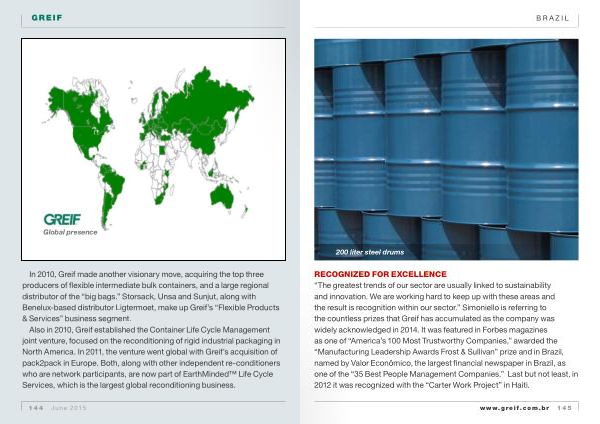 RECOGNIZED FOR EXCELLENCE “ The greatest trends of our sector are usually linked to sustainability and innovation . We are working hard to keep up with these areas and the result is recognition within our sector .” Simoniello is referring to the countless prizes that Greif has accumulated as the company was widely acknowledged in 2014 . It was featured in Forbes magazines as one of “ America ’ s 100 Most Trustworthy Companies ,” awarded the “ Manufacturing Leadership Awards Frost & Sullivan ” prize and in Brazil , named by Valor Econômico , the largest financial newspaper in Brazil , as one of the “ 35 Best People Management Companies .” Last but not least , in 2012 it was recognized with the “ Carter Work Project ” in Haiti .