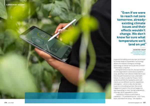 During her time in the UK , she learned that no one organisation could solve a systemic issue , and that multi-lateral collaboration was the only path towards a more sustainable future . In order to scale her impact , Holm understood that she needed to work with clients across different sectors , capabilities , and regions – which is why she decided to go to a consulting business . She joined Capgemini Invent in the UK , as Capgemini was expanding its client-facing sustainability offerings , which appealed to Holm .