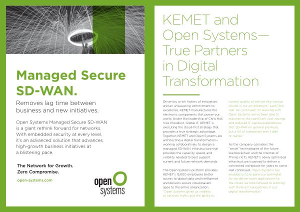 Driven by a rich history of innovation , and an unwavering commitment to excellence , KEMET manufactures the electronic components that power our world . Under the leadership of Chris Hall , Vice President , Global IT , KEMET is executing the cloud-first strategy that provides a true strategic advantage . Together , KEMET and Open Systems are architecting a digital transformation — working collaboratively to design a managed SD-WAN infrastructure that provides the capacity , speed , and visibility needed to best support current and future network demands .