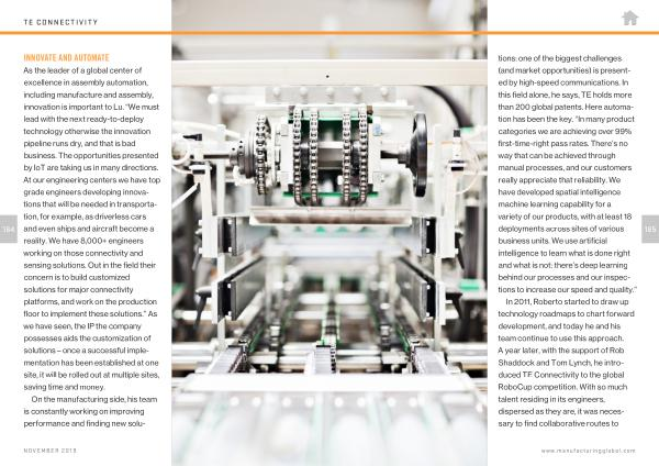 tions : one of the biggest challenges ( and market opportunities ) is presented by high-speed communications . In this field alone , he says , TE holds more than 200 global patents . Here automation has been the key . “ In many product categories we are achieving over 99 % first-time-right pass rates . There ’ s no way that can be achieved through manual processes , and our customers really appreciate that reliability . We have developed spatial intelligence machine learning capability for a variety of our products , with at least 18 deployments across sites of various business units . We use artificial intelligence to learn what is done right and what is not : there ’ s deep learning behind our processes and our inspections to increase our speed and quality .”