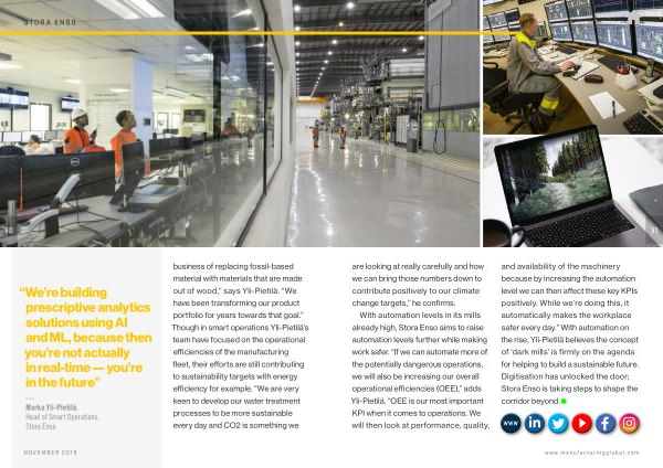and availability of the machinery because by increasing the automation level we can then affect these key KPIs positively . While we ’ re doing this , it automatically makes the workplace safer every day .” With automation on the rise , Yli-Pietilä believes the concept of ‘ dark mills ’ is firmly on the agenda for helping to build a sustainable future . Digitisation has unlocked the door ; Stora Enso is taking steps to shape the corridor beyond .