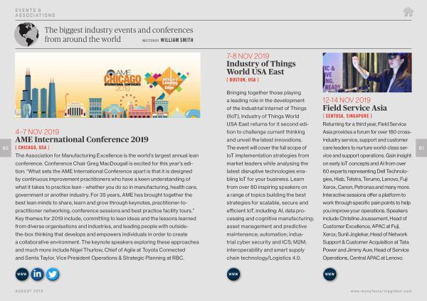 [ CHICAGO , USA ] The Association for Manufacturing Excellence is the world ’ s largest annual lean conference . Conference Chair Greg MacDougall is excited for this year ’ s edition : “ What sets the AME International Conference apart is that it is designed by continuous improvement practitioners who have a keen understanding of what it takes to practice lean - whether you do so in manufacturing , health care , government or another industry . For 35 years , AME has brought together the best lean minds to share , learn and grow through keynotes , practitioner-topractitioner networking , conference sessions and best practice facility tours .” Key themes for 2019 include , committing to lean ideas and the lessons learned from diverse organisations and industries , and leading people with outsidethe-box thinking that develops and empowers individuals in order to create a collaborative environment . The keynote speakers exploring these approaches and much more include Nigel Thurlow , Chief of Agile at Toyota Connected and Senta Taylor , Vice President Operations & Strategic Planning at RBC . AUGUST 2019