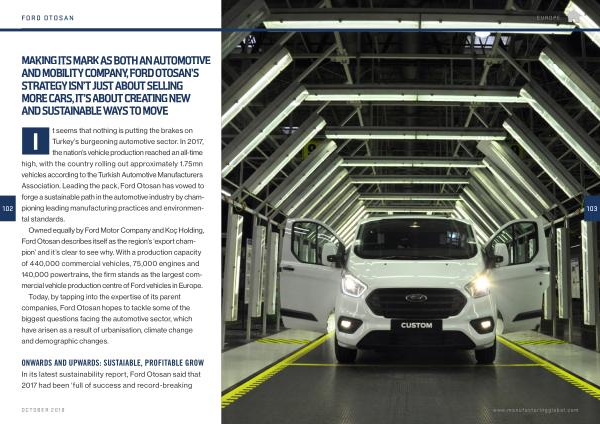 I t seems that nothing is putting the brakes on Turkey ’ s burgeoning automotive sector . In 2017 , the nation ’ s vehicle production reached an all-time high , with the country rolling out approximately 1.75mn vehicles according to the Turkish Automotive Manufacturers Association . Leading the pack , Ford Otosan has vowed to forge a sustainable path in the automotive industry by championing leading manufacturing practices and environmental standards .