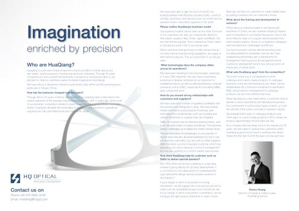Huaqiang is a precision metal component solution provider to mainly optical , but also watch , luxury accessory , medical and electronic industries . Through 35 years of experiences and constant reinvestments in production , HuaQiang is able to use precision to help its customers realise its widest imaginations and design .